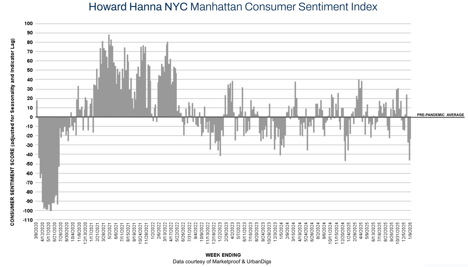 Manhattan recorded 85 signed contracts (+16% WoW | –8% YoY). The Manhattan Consumer Sentiment Index improved from –46% to –23%, a notable early-year inflection.