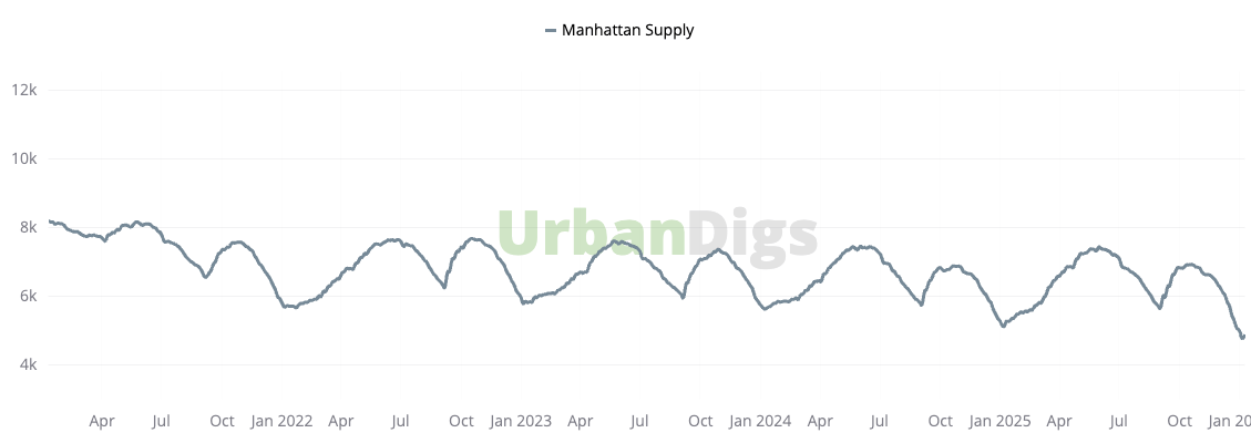 Manhattan active inventory declined for the eighth consecutive week, falling to 4,895 homes (–0.5% WoW | –19% YoY).