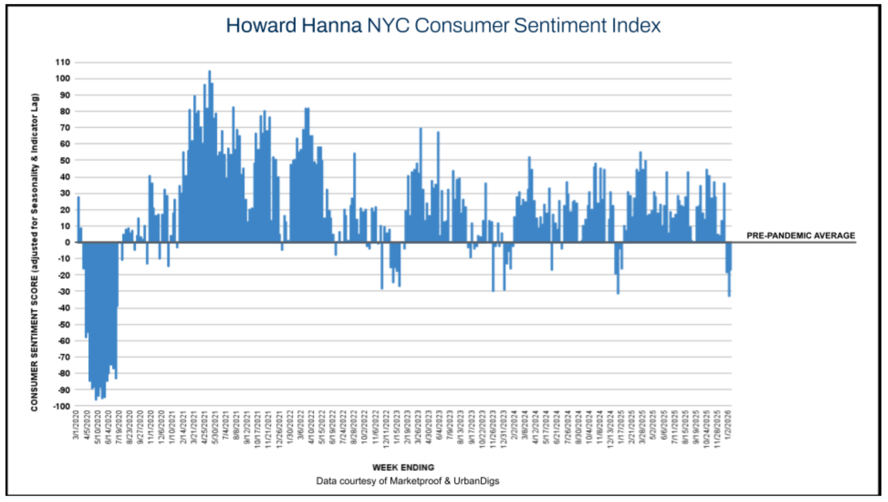 The Howard Hanna NYC Consumer Sentiment Index increased from –33% to –17%, signaling a typical post-holiday rebound as buyer engagement resumes at the start of the calendar year. Early-year momentum is most visible in new development, where activity remains concentrated in well-located, correctly priced projects with strong amenity offerings.
