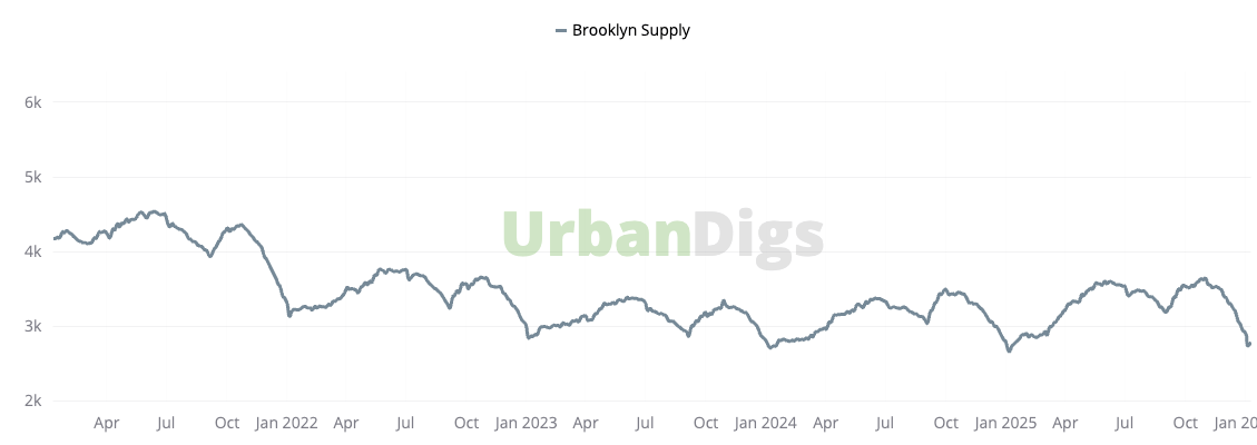 Brooklyn inventory decreased to 2,793 homes (–2.8% WoW | +1.9% YoY), marking the tenth straight weekly decline.