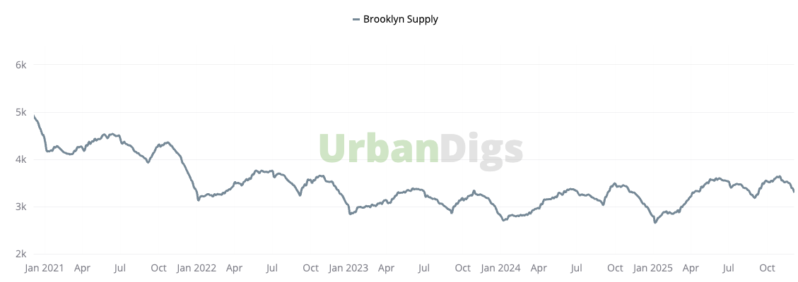 Brooklyn supply decreased to 3,307 homes (–2.9 percent WoW, +6.8 percent YoY), continuing a multiweek contraction even as annual levels remain elevated.