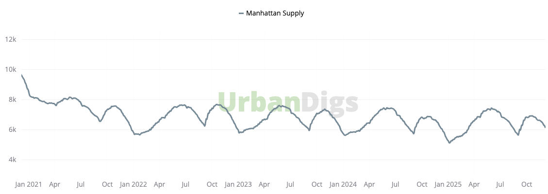 Manhattan’s active inventory slipped again to 6,136 homes (–3 percent WoW, 0 percent YoY), marking its third consecutive weekly decline .